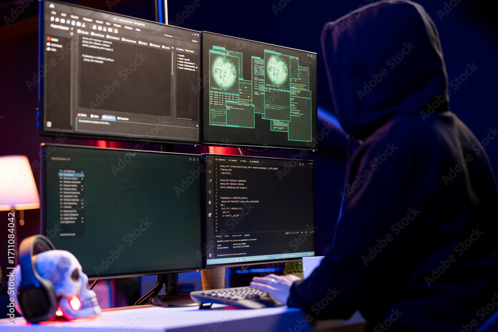 Hooded hacker in underground HQ coding malware designed to exploit network backdoors, Rogue programmer bypassing security measures such as logins and password protections