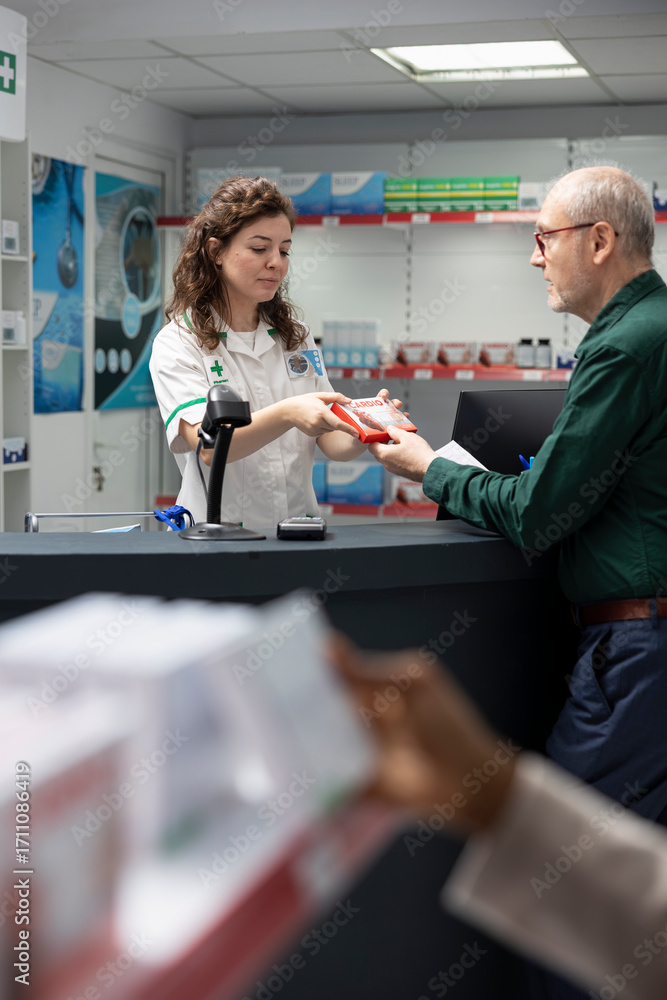Pharmacist recommending pills for wellness to old person at the checkout, giving advice at the pharmacy counter. Client seeking help with prescription pickup medication. Pharmacology assistance.