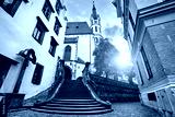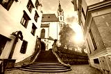 Czech Krumlov, Czech Republic. Streetview at Saint Vitus Catholic church entrance from the medieval antique street with old houses during sunset. Popular travel destination in Europe.