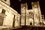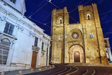 Lisbon, Portugal. Lisboa Cathedral (Se de aka Santa Maria Maior Church). Famous architectural landmark in the Alfama Old Town district. Night view with illumination and blue sky. Travel destination.