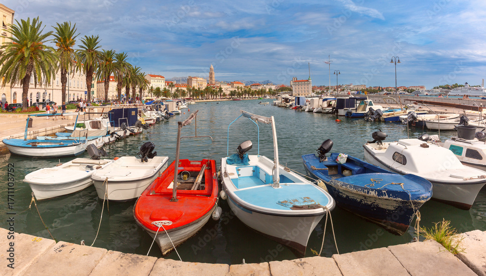 Small boats moored at the Riva Promenade in Split, Croatia, with the bell tower of Diocletian Palace in the background