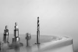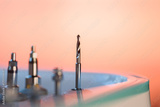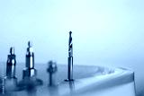 Full set of dental implant drill bits in surgical tray, close-up of professional dentistry equipment