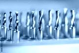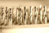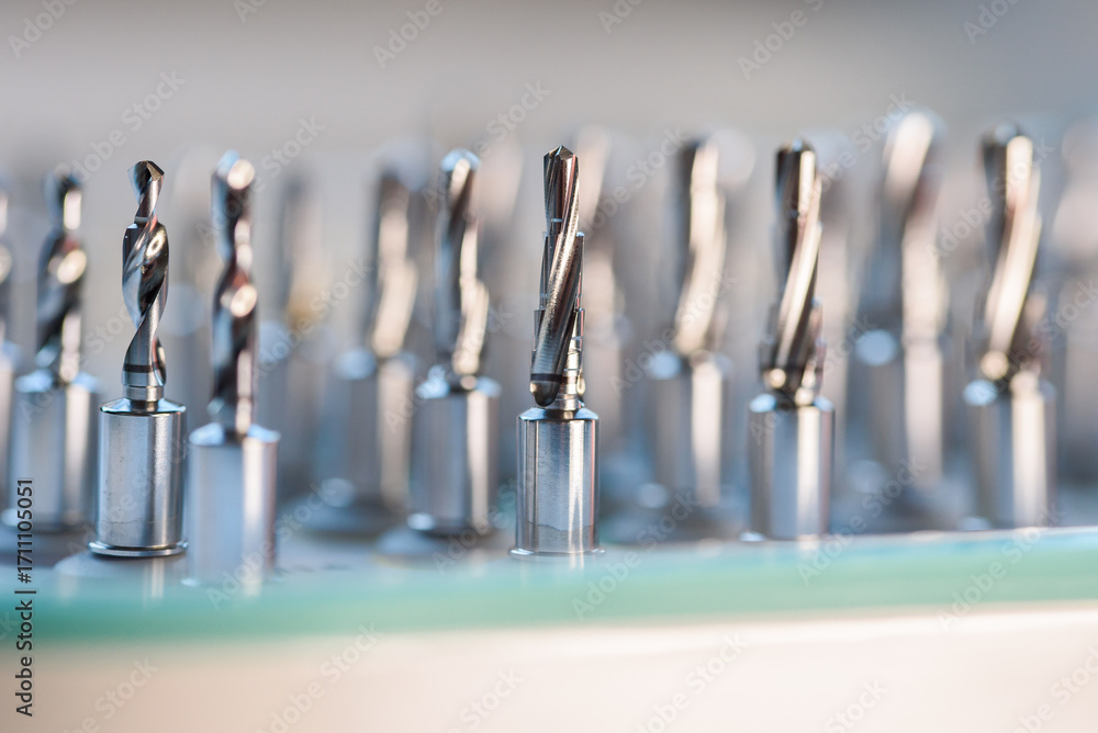 Full set of dental implant drill bits in surgical tray, close-up of professional dentistry equipment