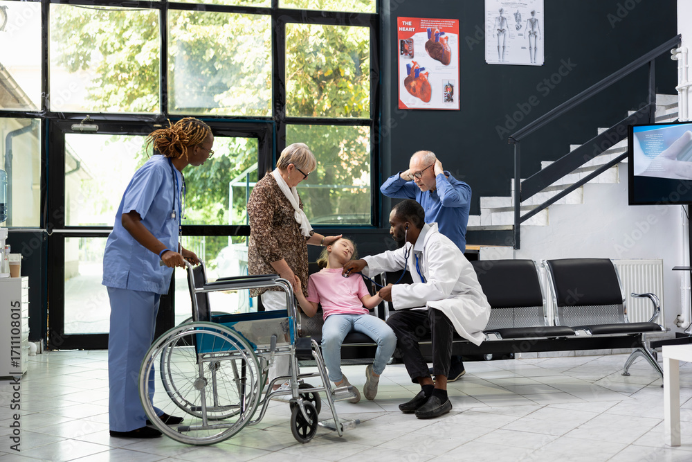 Elderly grandparents worried and shocked after child collapses at hospital, calling for immediate attention and first aid from medical team during pediatric health scare in waiting area.