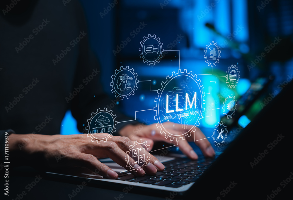 LLM Large Language Model and AI technology concept. Man using laptop with LLM interface icons, artificial intelligence, deep learning, machine learning, natural language processing, Chat AI, Chatbot,