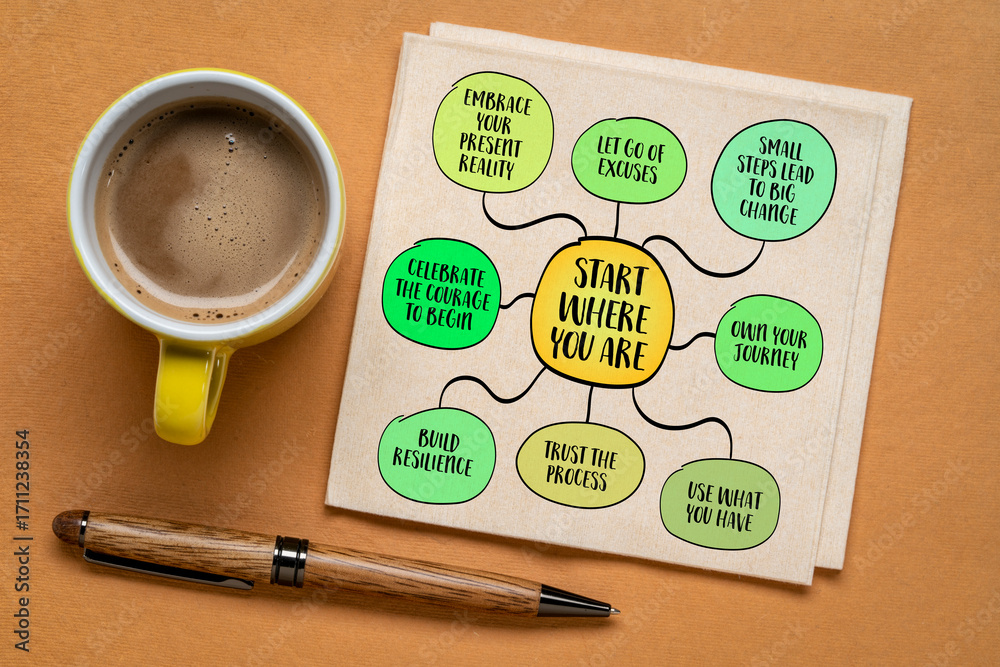 Start where you are, a powerful reminder that progress doesn't require perfection, ideal conditions, or waiting for a better time. Inspirational infographics mind map sketch.