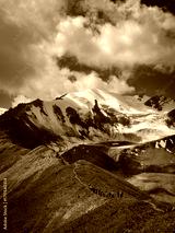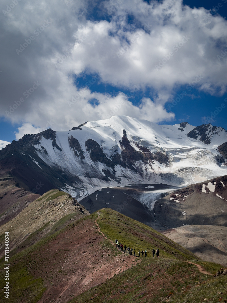 A line of trekkers follows a narrow grassy ridge, overlooking the crevassed glaciers of Lenin Peak beneath dramatic clouds.