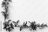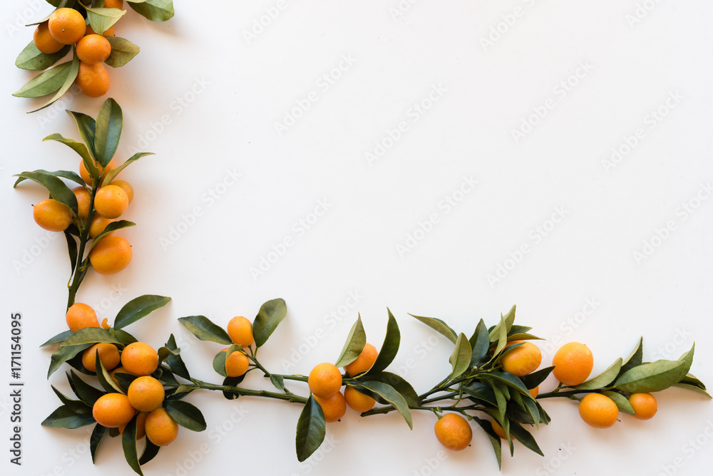 High angle view of nagami kumquats with stems and leaves on white background with copy space
