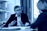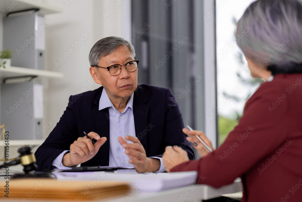 Experienced Asian legal advisor discusses case with client in professional office setting providing expert advice and solutions