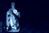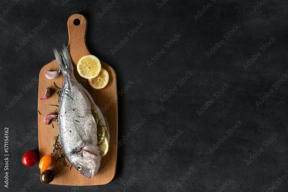 Mediterranean fish - dorado and vegetables on the cutting board. Top view.