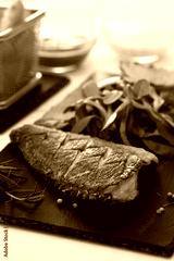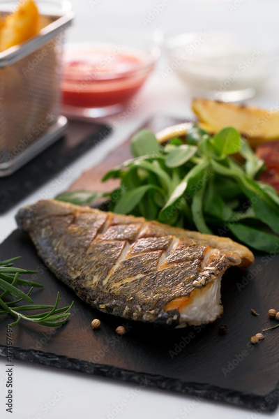 Baked dorado with fresh salad and vegetables. Vertical orientation
