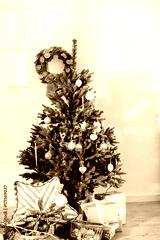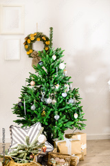 Beautifully decorated Christmas tree with presents under it in the room specially decorated for this holiday. Concept of Christmas, winter and New Year