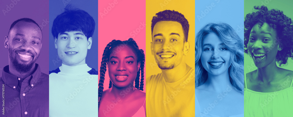 Composition with artistic portraits of diverse people in vibrant duotone backgrounds. Concept of multicultural identity, creative equality, inclusiveness, and positive representation.