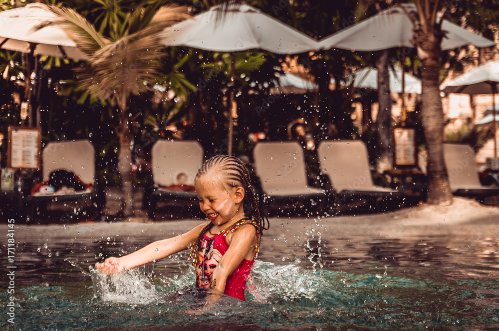 little girl is splashing in the pool