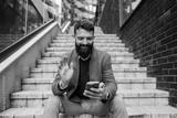 Portrait of an elegant man in suit sitting on stairs with cellphone in hand and having online video call while waving at it.