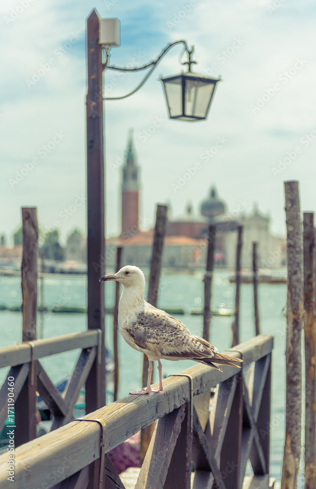 Seagull on the old pier in Venice, Italy