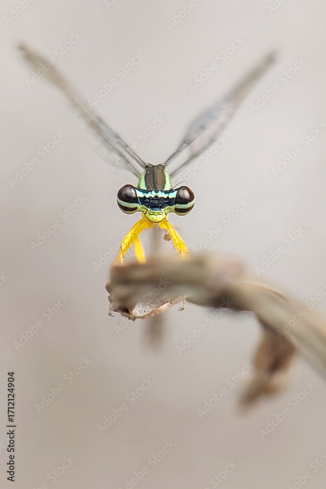 Macro close-up of a damselfly (Zygoptera) perched on a dry leaf.