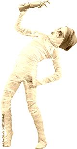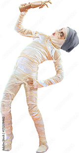 Child dressed as mummy holding mannequin hand in dramatic Halloween pose. Concept of costume play, fantasy acting, spooky children’s character, and Halloween theme. Transparent background