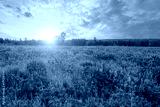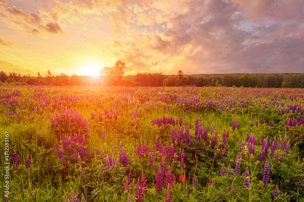Purple lupine flowers field with green grass at sunset or sunrise. Wild lupine blooming meadow. Open air rural landscape.