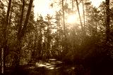 Forest path winding through green trees. Sunlit park landscape. Outdoor escape and natural scenery for relaxation. Vintage film aesthetic.