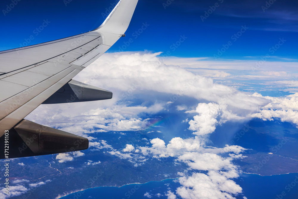 Airplane wing view against clouds and emerald green Atlantic Ocean near Miami coastline.