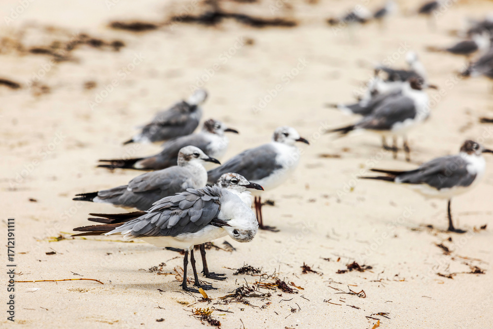 Close up view of flock of seagulls standing on sandy beach with scattered seaweed on background. Miami Beach. USA.