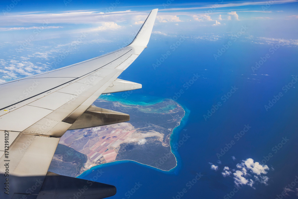 View from airplane window during landing in Miami against turquoise Atlantic Ocean coastline. USA.