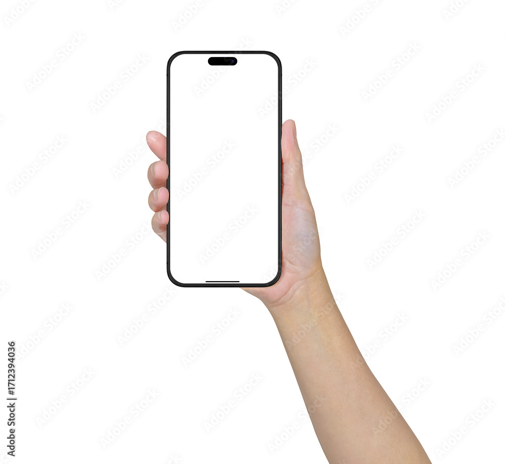 Asian woman's hand holding a modern new smartphone with blank screen isolated