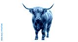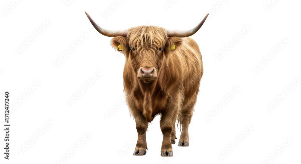Isolated Highland cow standing with long horns, a breed from Scotland, livestock portrait
