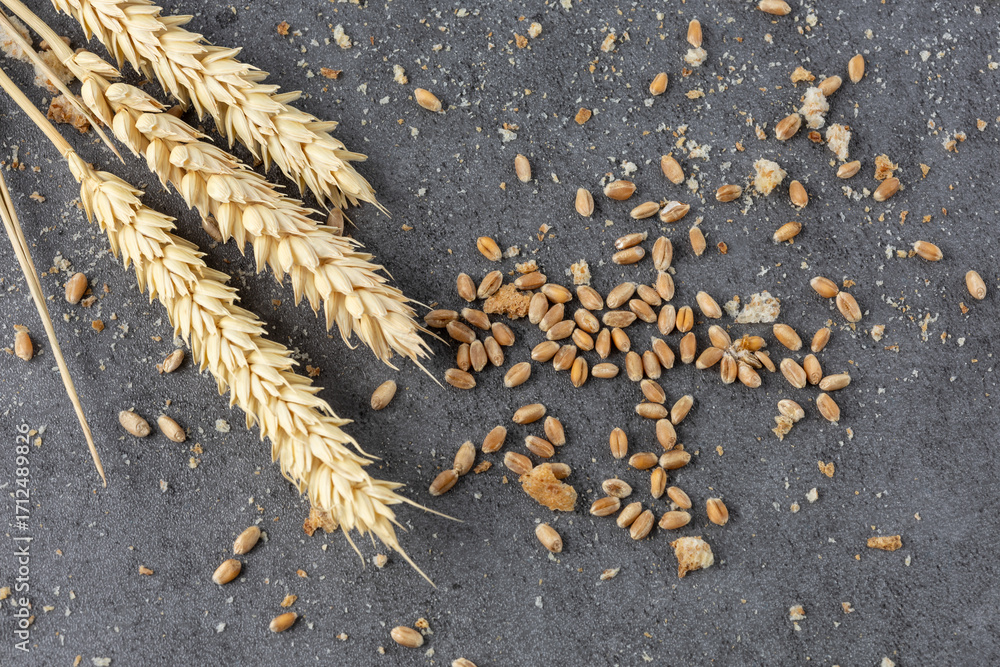 Natural dry wheat spikes spikelets closeup with whole cereal grains on dark stone background.