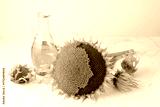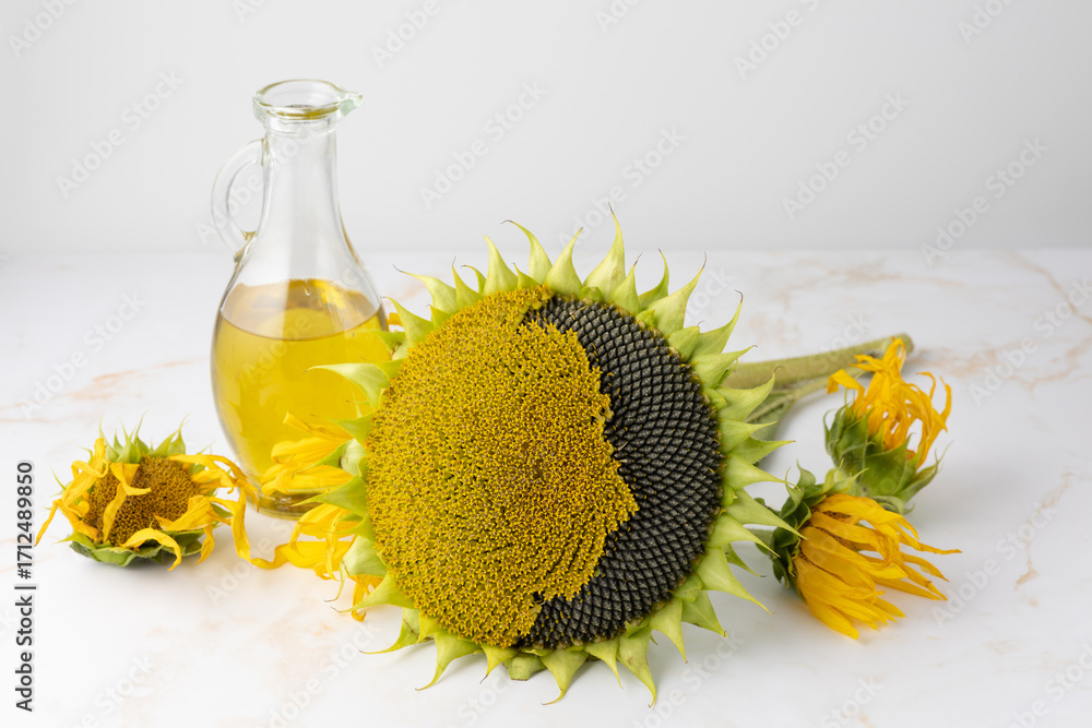 Large sunflower flower without petals, oil glass bottle on marble table background. New harvest.