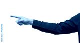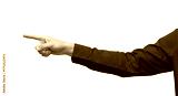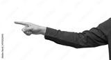 Isolated arm and hand gesturing pointing away, sleeve, blue shirt, Caucasian human arm