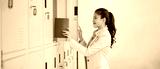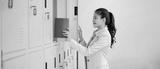 A woman is standing in front of a row of lockers, opening one of them to retrieve a book. Concept of organization and productivity