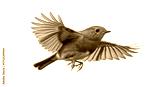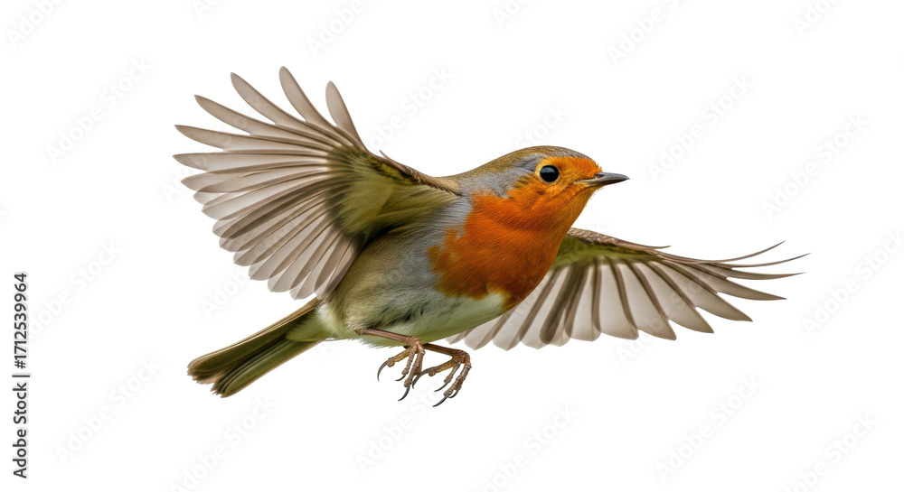 Isolated European robin flying, open wings, colorful bird with red breast in mid-air