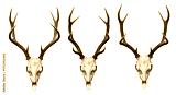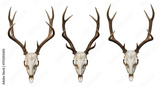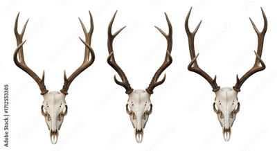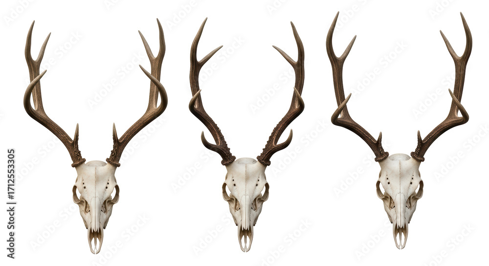 Isolated Animal skulls with antlers, wildlife trophy heads, spooky Halloween theme decor