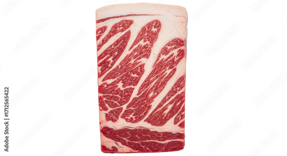 Isolated raw piece of Wagyu beef, marbled meat pattern visible, a very delicious product