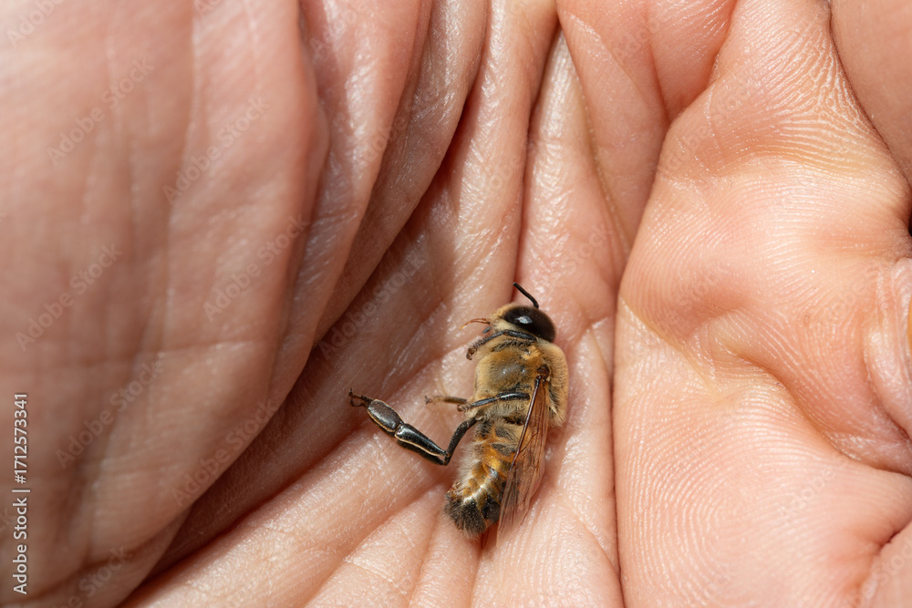 Beekeeper holding dead honey bee in hand: climate change and environmental issues