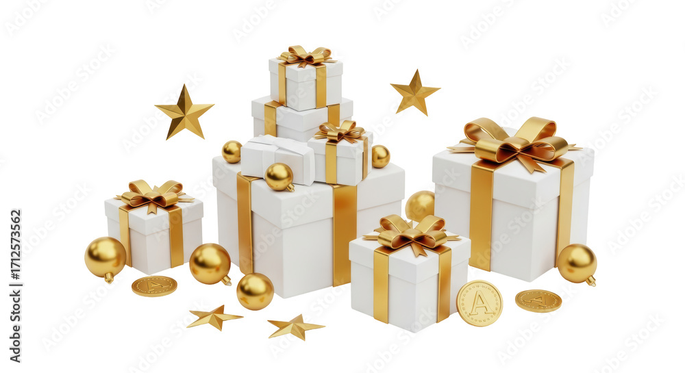 Isolated gift boxes stacked with golden ribbons and stars, festive decoration, present