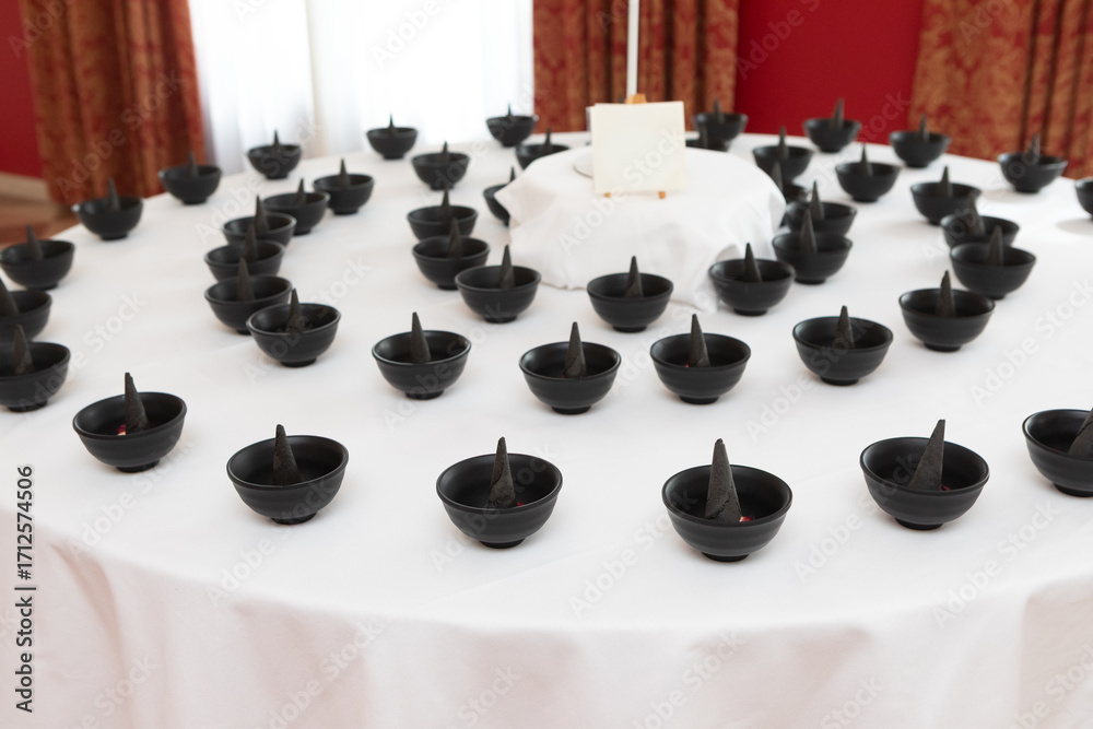 Incense cones burning in black bowls on white tablecloth for event or ceremony
