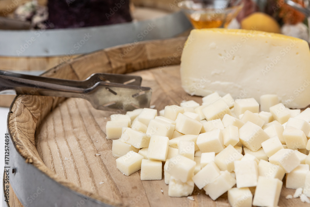 Cheese cubes with tongs on wooden barrel top at buffet table