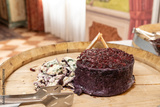 Lavander cheese with cranberries and blue cheese with herbs sitting on wooden barrel lid during a buffet