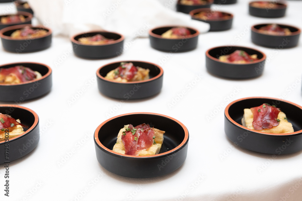 Rows of delicious appetizers with cured meat and bread being served on a white tablecloth