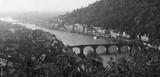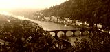 View on the Old Bridge in Heidelberg, Germany. A panoramic cityscape with the Neckar river and the historic downtown Altstadt.