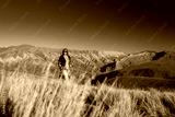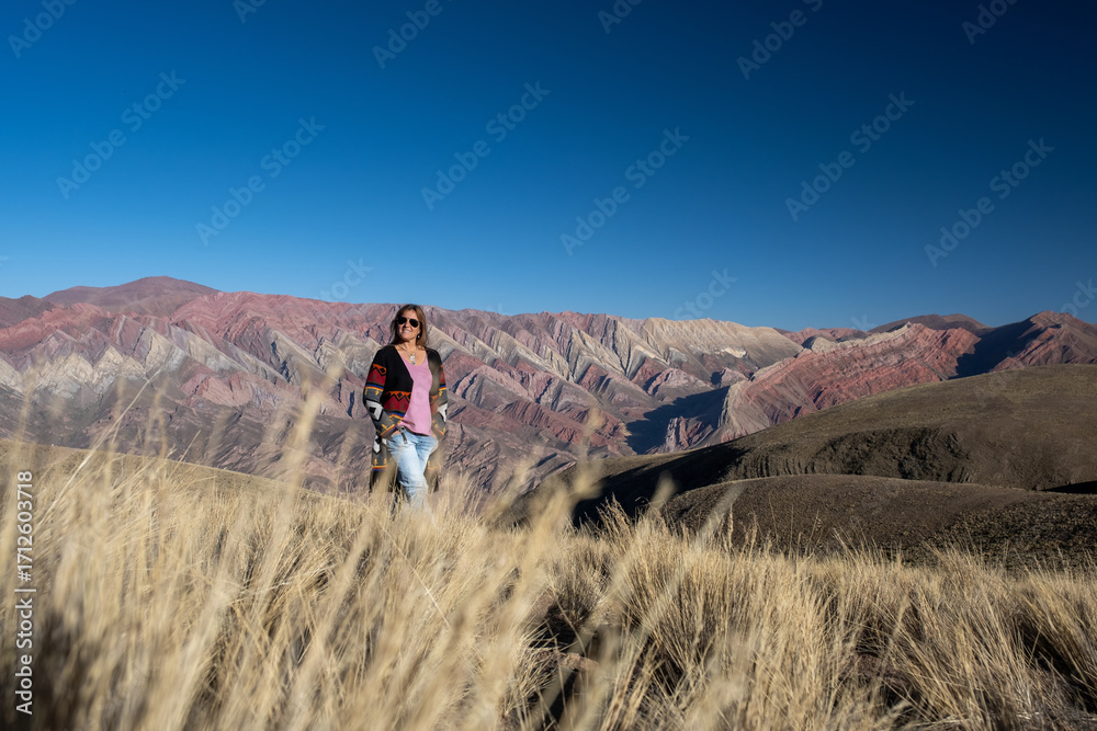 A smiling woman stands in golden grass, admiring the breathtaking, multi-colored Serranía del Hornocal mountains in Jujuy, Argentina. A vibrant travel adventure