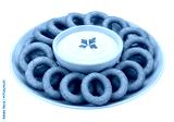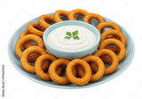 Isolated plate of crispy onion rings with dip ready to eat for appetizer or snack