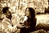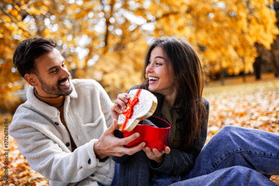 Romantic young couple giving presents to each other in colorful autumn park, joyful and loving fall moment.
