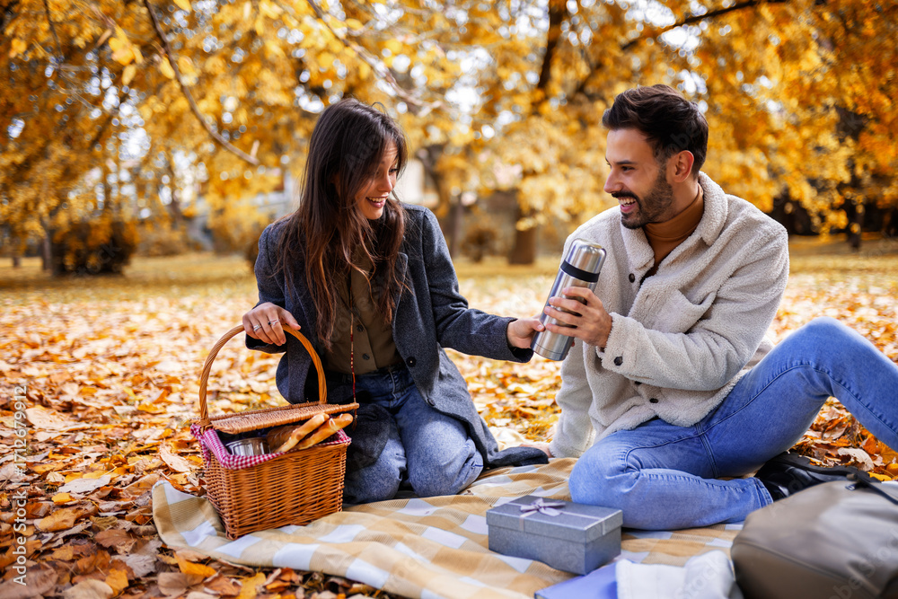Relaxed young couple enjoying coffee together in colorful autumn park, romantic and cozy fall moment.