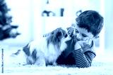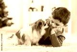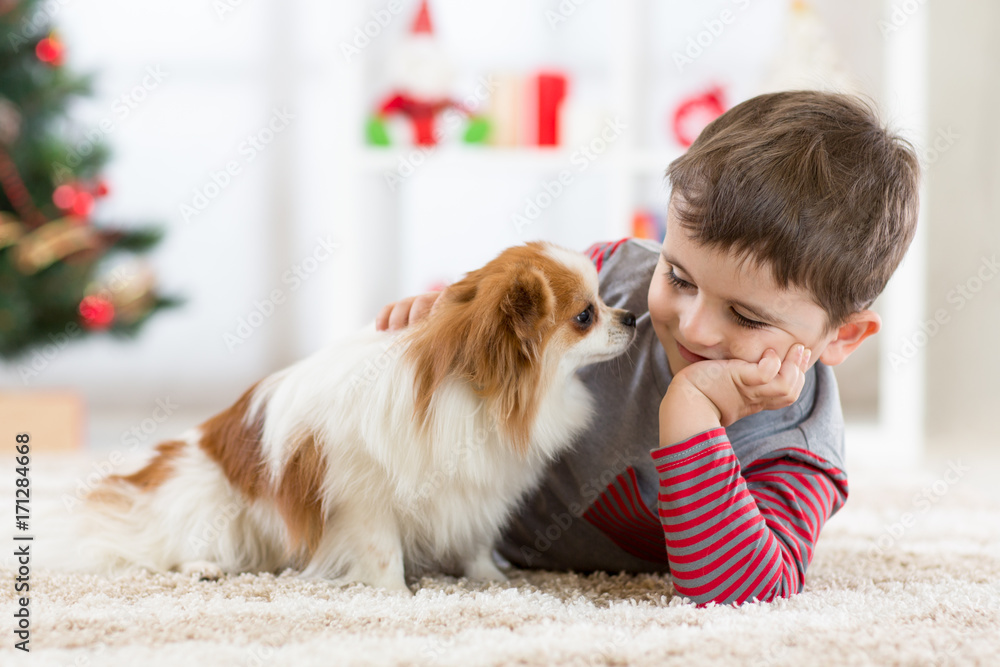 Little baby boy with dog lying on the floor at christmas tree