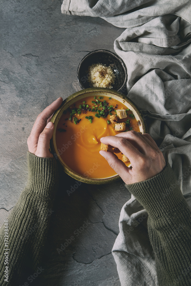 Bowl of vegetarian pumpkin carrot soup served with saffron salt, croutons and onion on textile on dark gray kitchen table. Female hands. Top view with space
