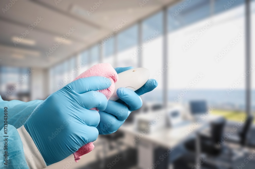 Cleaning service disinfects Technics from coronavirus, antiseptic processing computer.